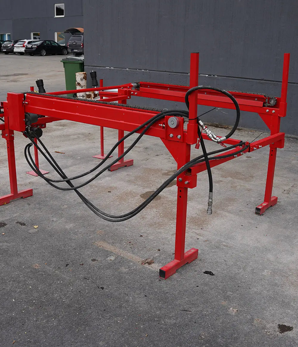 Stockbord Version 2 är ett hydrauliskt drivet matarbord som effektiviserar vedhanteringen. Med starka kedjor, tandade rullar och förstärkt konstruktion transporterar det stockarna framåt till vedmaskinens inmatning med minimal friktion.