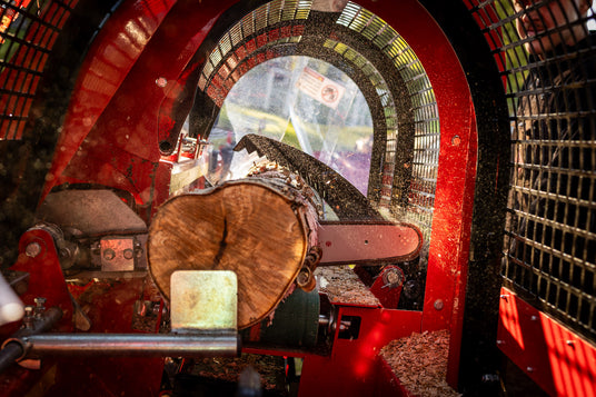 Det absolut viktigaste är en nödstopp och att den finns placerad nära förarzonen. Så att du enkelt kan stoppa maskinen om något händer. Det andra du behöver är säkerhetsburar över kap- och klyv-sektionerna. Se även till att säkerhetsburarna är utrustade med ett öppningsstopp. Så att maskinen inte kan köra när burarna är uppfällda.