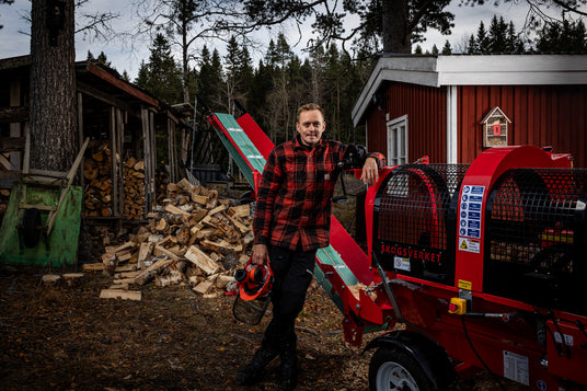 En fullhydraulisk vedmaskin tillsammans med ett stockbord eller en stocklyft är gårdens hjälte när det kommer till vedhanteringen. Mata stocken, kapa, klyv och flytta till vedhögen. Allt med hjälp av spakarna i förarzonen.
